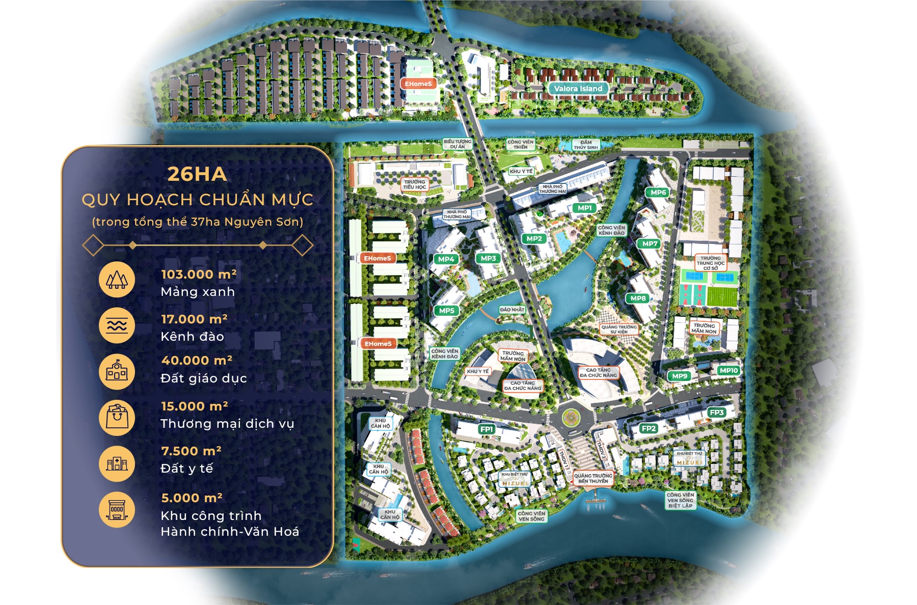 • 17.000 m² Kênh đào: Mang hơi thở sông nước len lỏi vào từng không gian sống.